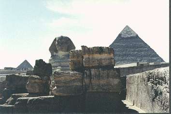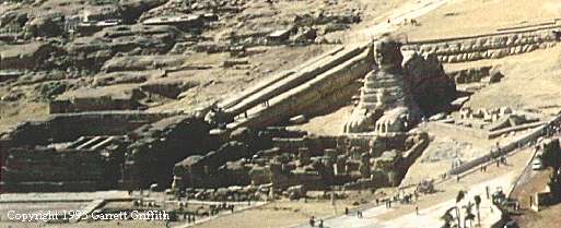 FROM THE EAST-A very awesome place - The Sphinx, the Sphinx Temple, the Granite-Lined Valley Temple, the Causeway connecting it to the second pyramid. These are some of the biggest and oldest structures on earth. No inscriptions have been found on any of them and no record of their construction. Egyptologists believe them to have been built by the 4th Dynasty Pharaoh Khafre.