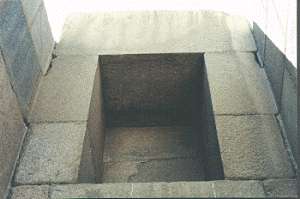 This ancient stone coverplate, large enough for a man to fit through, is above a deep vertical shaft of unknown depth or purpose. Water fills this shaft to within a foot of the cover plate. (#17). It is in the bottom of the short underpass (#15) which goes under the walkway extending eastward from the south entrance to the valley temple.