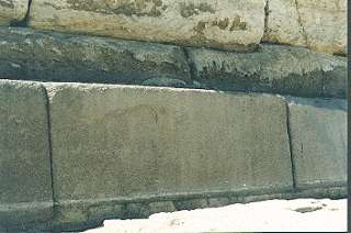 This huge block of granite is one of the remaining "lining" stones on the front of the "granite lined" temple. It is over 4' tall and nearly 20' long. Originally the walls of this bulding were nearly forty feet tall. The huge stones behind them are the original core blocks of limestone. There is an ongoing debate about when the limestone blocks were put in place. They appear to be very eroded and may have been assembled earlier than the granite ones. The age debate may be settled when the results of carbon dating research started in 1994 is published.