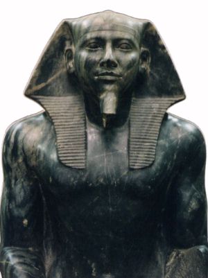 This diorite sculpture was found upside down, buried and broken in a shaft (#16) in this temple. It is believed to represent the pharaoh Khafre. The divine falcon Horus, son of Osiris and Isis, guardian deity of the pharaohs, is seated behind the figure's head. |