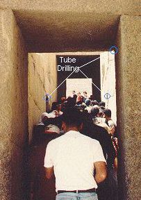 Almost all the doorways in this temple show evidence of tubedrilling in granite. It seems that the holes were used to hold in place long vertical rotating shafts on which the doors were hung, like hinges.