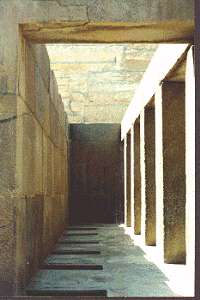 The granite interior. Originally roofed over with an upper courtyard, the brilliant sun light probably shone through those thin slots at the top on the south wall. Granite and basalt wall blocks, alabastar floor. Austere and unadorned, this temple has no incised inscriptions or reliefs. There are no pictorial or linguistic clues to its builder's origins.