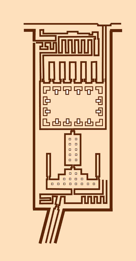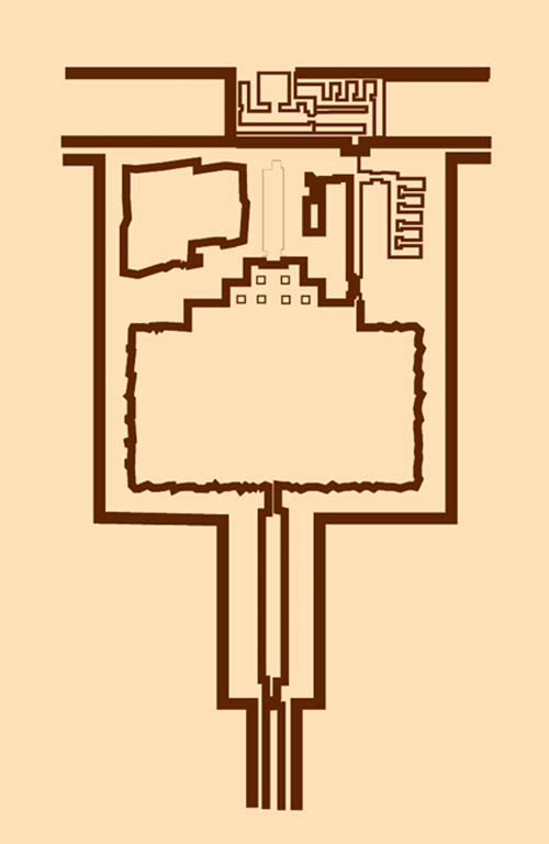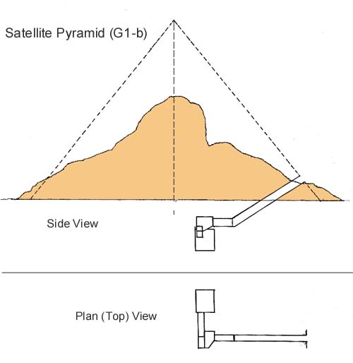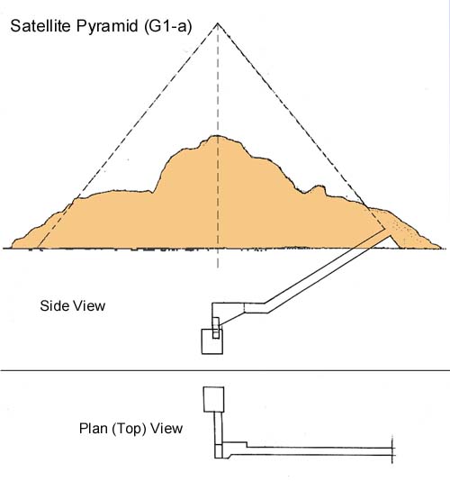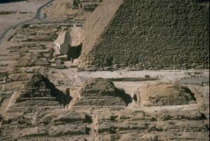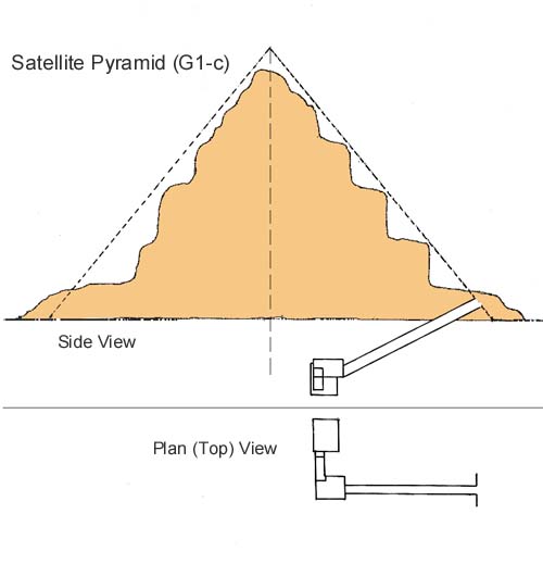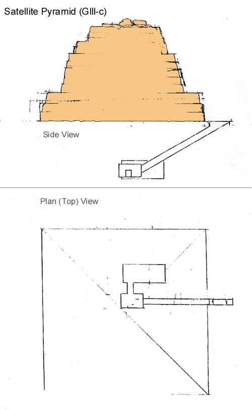 "The Guide to the Giza Plateau" and the photo (below right), show the Pyramid Temple (lined with basalt paving stones) and the four satellite pyramids. The small fourth satellite pyramid was recently discovered and excavated.